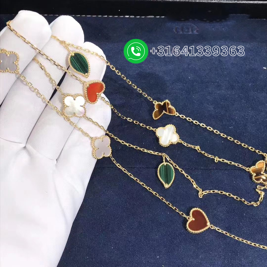 A beautiful Van Cleef & Arpels 18k Yellow Gold Gems 12 Motifs Lucky Alhambra Long Necklace. The necklace features 12 motifs, with a mixture of symbols such as hearts, butterflies, leaves and clovers. The motifs are set with carnelian, tiger’s eye, white & grey mother of pearl and malachite.